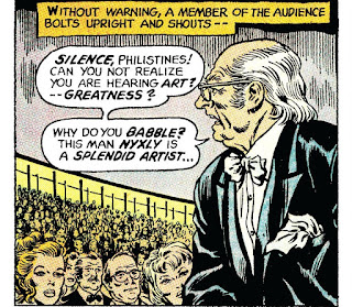 Similarly it's easy to agree with the audience member who suddenly stands up to admonish the audience for ruining the performance with their restless chattering. He declares Nyxly to be "a splendid artist" and voices the other man's frustration at the crowd's "babble"--