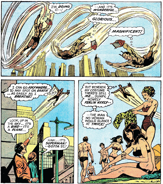 And O'Neil teasingly plays with his readers' loyalties, the pianist condemning Superman as "an idiot stuffed with muscle". We can't argue with the "muscle" bit, though "idiot" is a bit strong, and we can understand the performer's frustration at having his big moment spoilt. I for one have no problem in admitting that I probably have more in common with the piano-playing, under-confident character of Ferlin Nyxly than the muscular, assured Man of Steel, and I suspect many of the books readers did too in 1971, as well as today. So, despite suspecting that this peculiar figure will not work out to be a heroic character, the reader can't help but feel empathising with him, if only a little bit--
